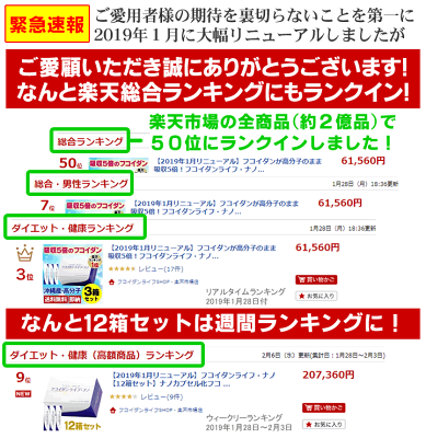 2019年のリニューアルにより2包中にフコイダン10%増量(660mg→733mg)に加え、サポート成分もアガリクス(ヒメマツタケ=姫マツタケ)100mg、国産の霊芝(直井霊芝=直井GY株)50mgから真昆布仮根(ガニアシ)100mg、同エキス末100mg、長命草(ボタンボウフウ)100mgへ変更&大幅増量しました。