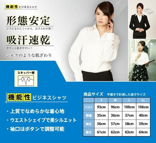 シワになりにくい!お手入れが楽な形態安定加工!サラッと乾きやすい吸汗速乾機能!シルクのような肌触り!ウエストシェイプで美シルエット!袖口は調整可能なボタン付き!■セット内容 シャツ×1■適応サイズ S:バスト72cm〜80cm、身長154cm〜162cm M:バスト79cm〜87cm、身長154cm〜162cm L:バスト86cm〜94cm、身長154cm〜162cm LL:バスト93cm〜101cm、身長154cm〜162cm■メイン部分の長さ(着丈など) S:61cm M:62cm L:63cm LL:64cm■実寸 S:B93cm・W79cm・肩幅35cm・袖丈56cm M:B96cm・W82cm・肩幅36cm・袖丈57cm L:B100cm・W86cm・肩幅37cm・袖丈58cm LL:B106cm・W92cm・肩幅40cm・袖丈59cm■開き仕様 前ボタン■素材 ポリエステル94%、ポリウレタン6%■お洗濯に関するご注意事項 ※塩素系漂白剤による漂白はしないでください。