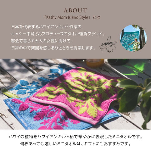 ハワイアンキルト作家、キャシー中島さんプロデュースの、ハワイの代表的な植物をモチーフにした、ふんわり柔らかなミニタオルです。
