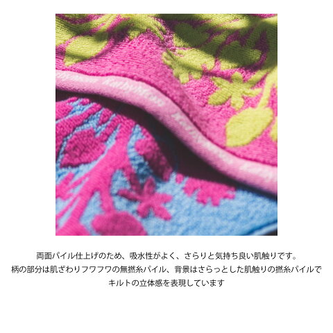 柄の部分は肌ざわりフワフワの無撚糸パイル、背景はさらっとした肌触りの撚糸パイルでキルトの立体感を表現しています。