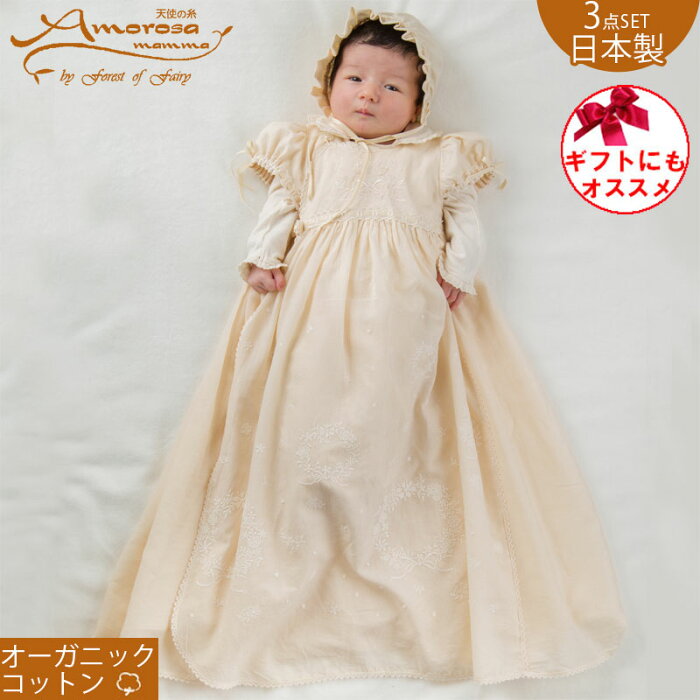 新生児 赤ちゃん用 ベビーセレモニードレス ツーウェイドレス お帽子3点セット 日本製 オーガニックコットン フローラルレース 男の子 女の子にも お宮参り 結婚式 退院時などにおすすめ 春 夏 秋 60 アモローサマンマ 送料込