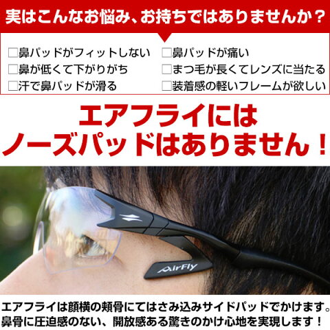 紫外線カット率99%以上・可視光線透過率32% エアフライにノーズパッドはありません!エアフライは顔横の頬骨にてはさみ込みサイドパッドでかけます。
